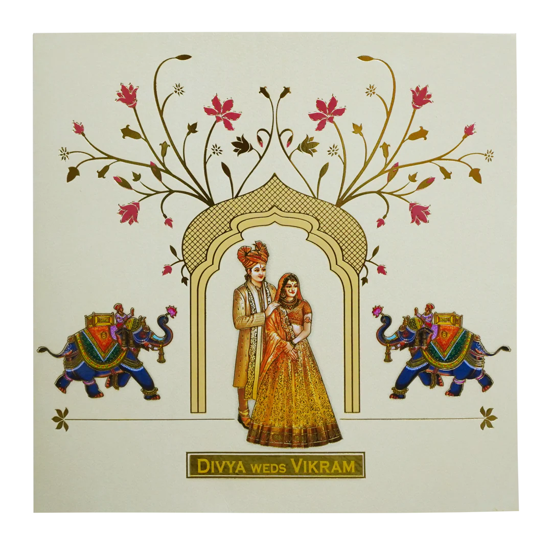 This bride & groom card features textured laminated sheet with premium gold foiling and an acrylic name plate. It includes a folded inserts and an envelope.