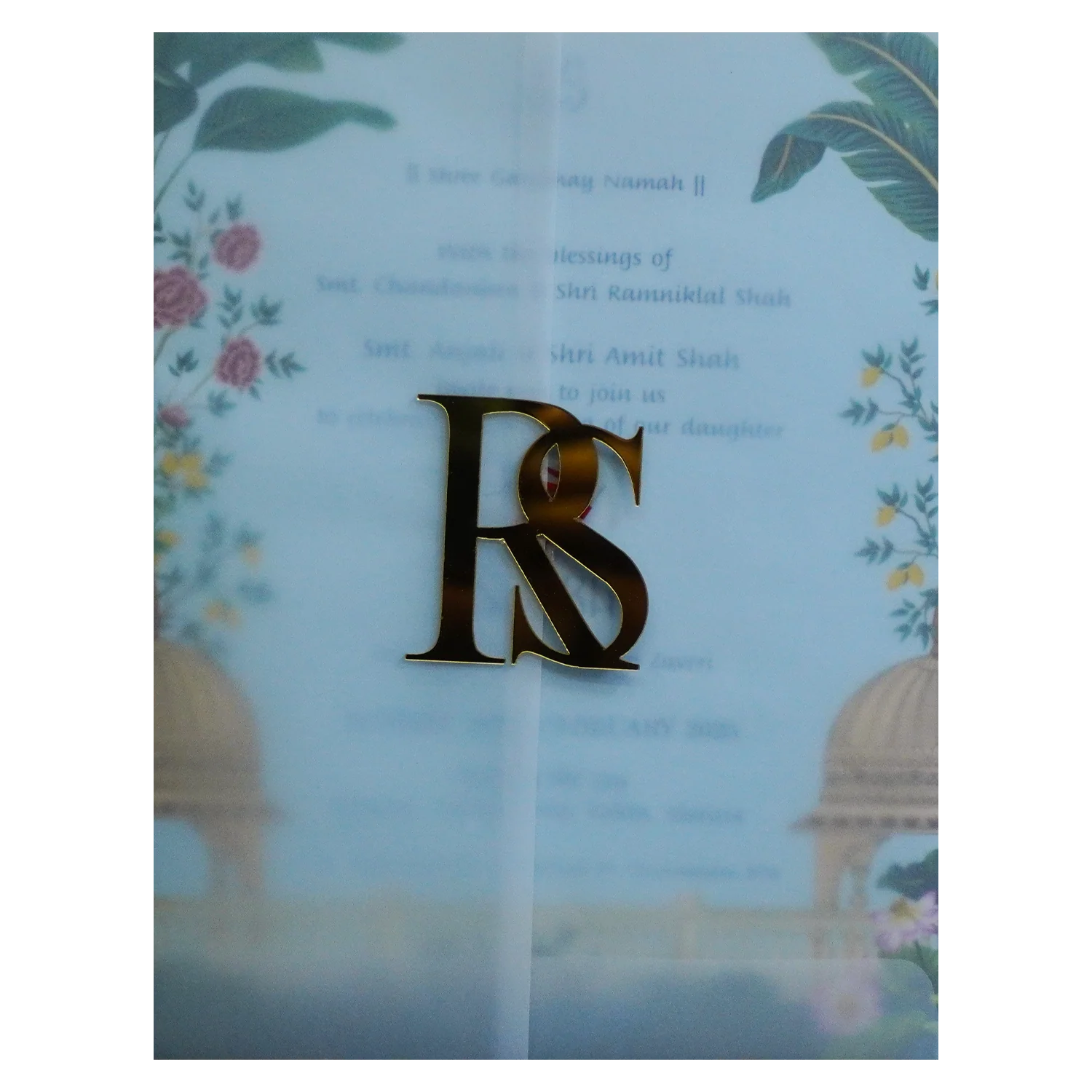 Pale Blue tracing sheet invitation card has acrylic initials. It has three inserts and an envelope.