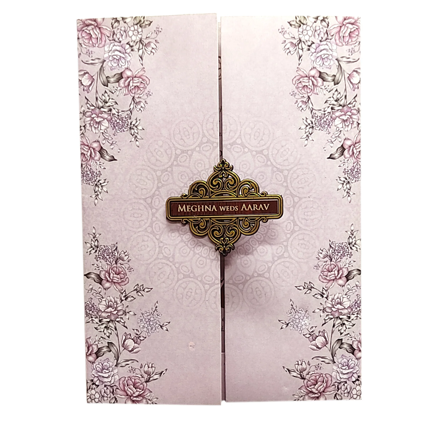 Pale Lilac floral wedding card has front door opening with MDF and acrylic nameplate. It include two inserts and an envelope.