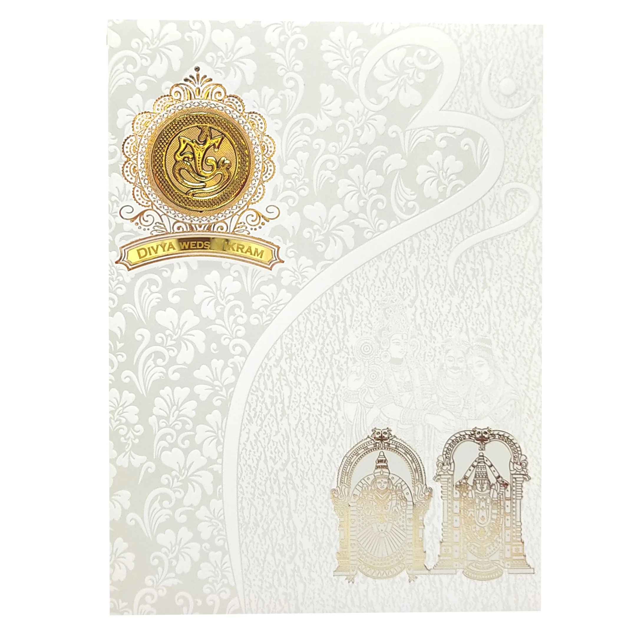 Let our premium screen wedding invitations showcase your creativity and style, providing a beautiful and interactive way to invite your guests to your wedding celebration. This invite features a white embossed background across the main card, cover and inserts. This card also features an exceptional design of OM at the top right. Not just that, We have also designed Lord Balaji and padmavathi at the bottom right in gold foiling print.