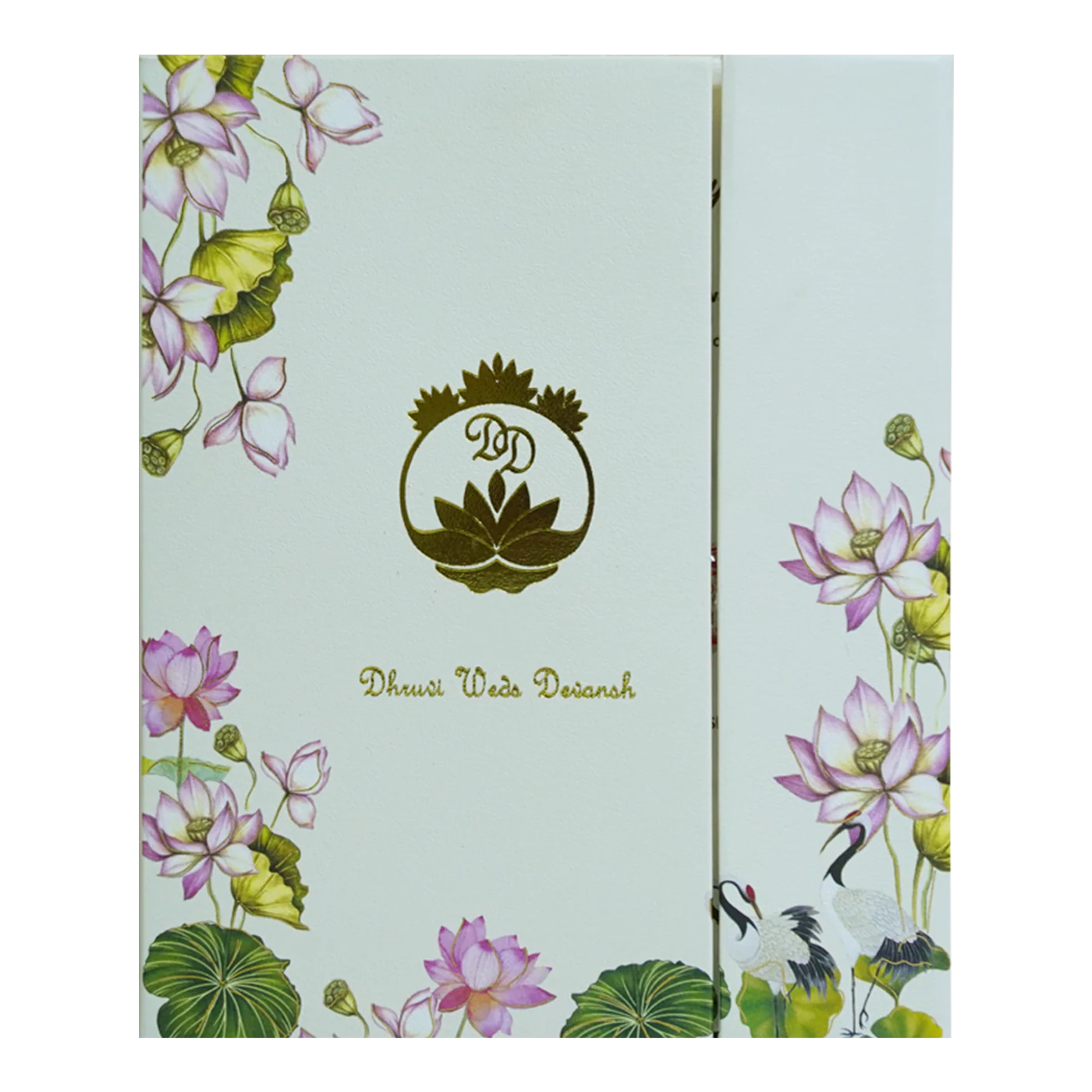 White wedding card features padded card with floral lotus designs. The card comes with three floral designs inserts and door type opening
